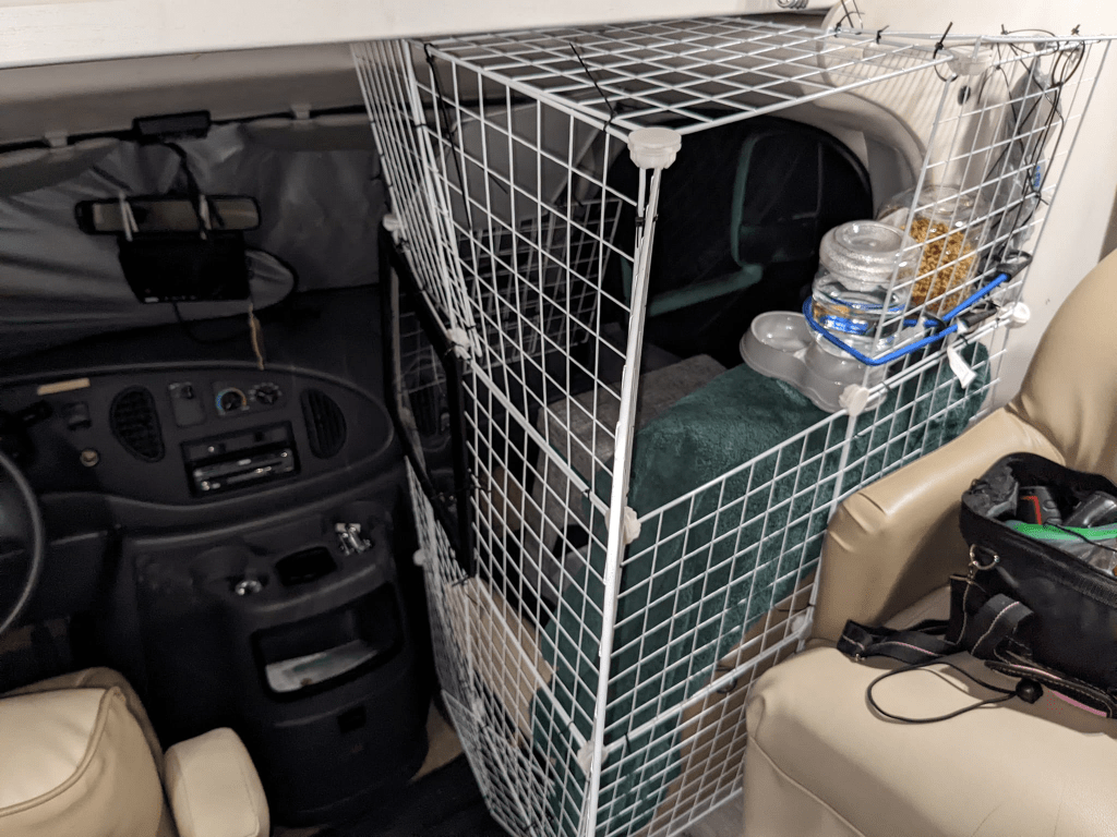I’ve spent the last several hours constructing an elaborate Peter Containment Device for tomorrow’s trip, to keep him off my lap while I’m driving. Now, let’s see if it contains him for more than five minutes before he finds a way to ooze out of it