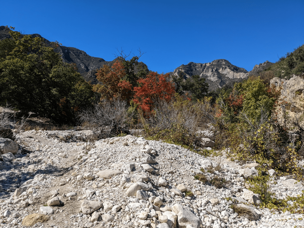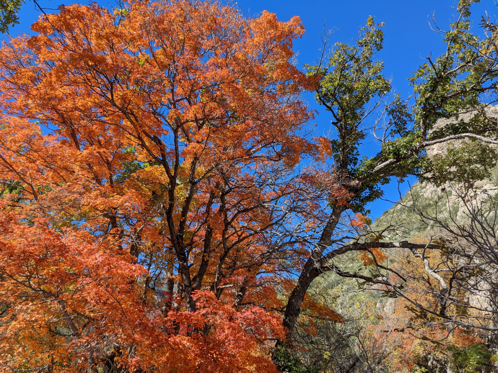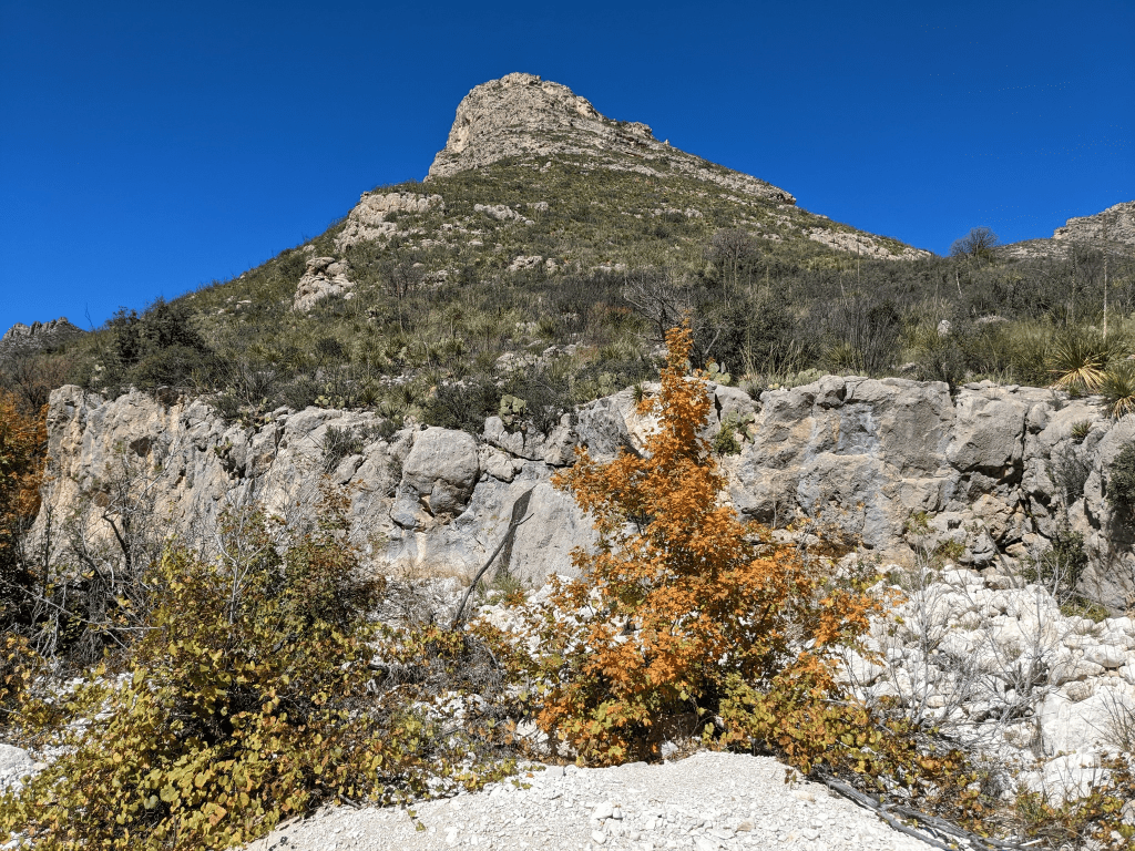It was a gorgeous day for a hike in Guadalupe Mountains National Park! I hiked McKittrick Canyon to Pratt Cabin, and got to enjoy the beginnings of fall foliage (which won’t peak for a couple of weeks yet probably). The Guadalupe Mountains are a desert environment, but the canyon shelters a whole different ecosystem with maples and madrone trees (which I didn’t even know about, but they are very cool!). I also got to see my first tarantula in the wild.