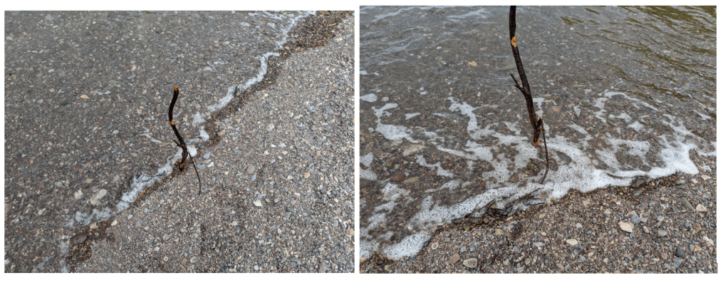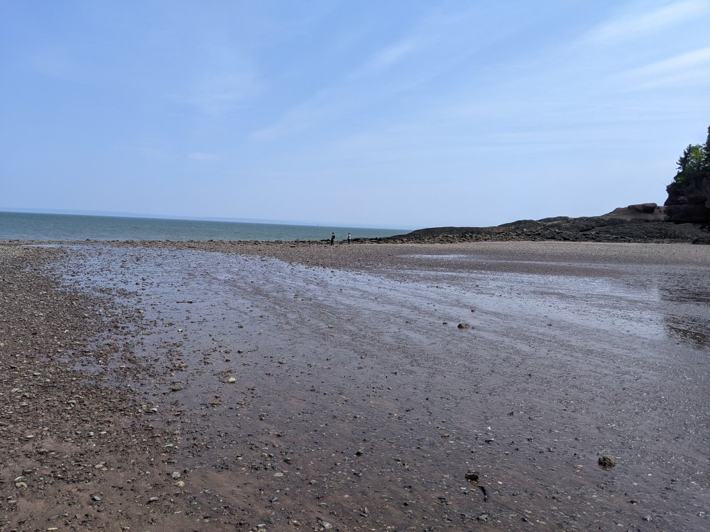 Last night, I stuck a stick in the sand at the very highest edge of the waves’ lap just before high tide. Five minutes later, the water had washed up six inches beyond it. Today, the stick was still there, but the water was probably a good hundred yards (meters? this is Canada) away.