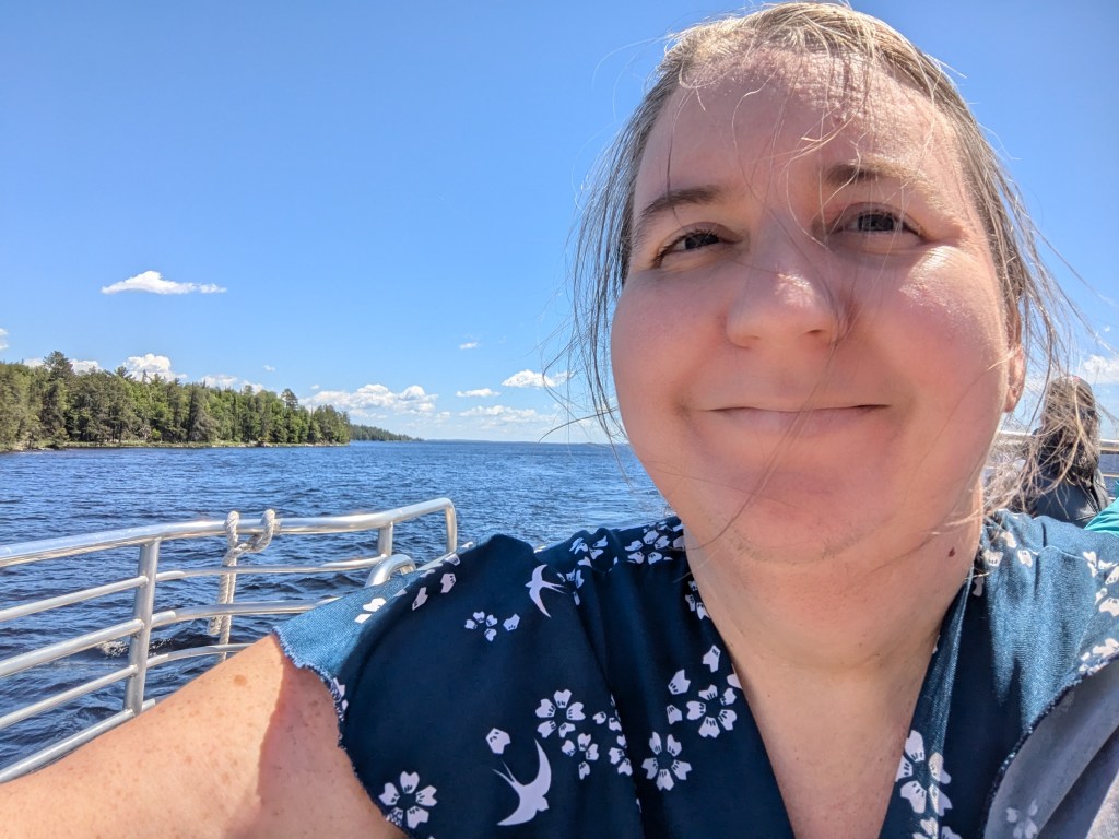 Ranger Peter is clearly a birding enthusiast and was able to point out a lot of feathered fauna to us, including Turkey vultures, cormorants, a loon, and several bald eagles. I tried to get pictures of the eagles, but that’s hard to do without a telephoto lens, and the results aren’t worth sharing here. So here’s a selfie instead.