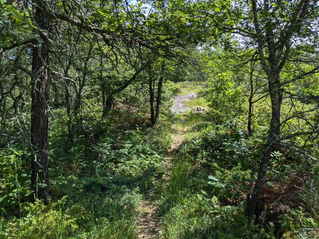 It was overgrown, and in some places ran out onto slabs of rock where there was no visible trail bed or markings. On one of these I lost the forward trail and had to cast around for a while before I found it. (I still knew the way back, so I wasn’t “lost-lost.”) Can you see the trail here? I couldn’t.