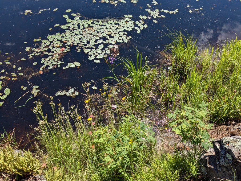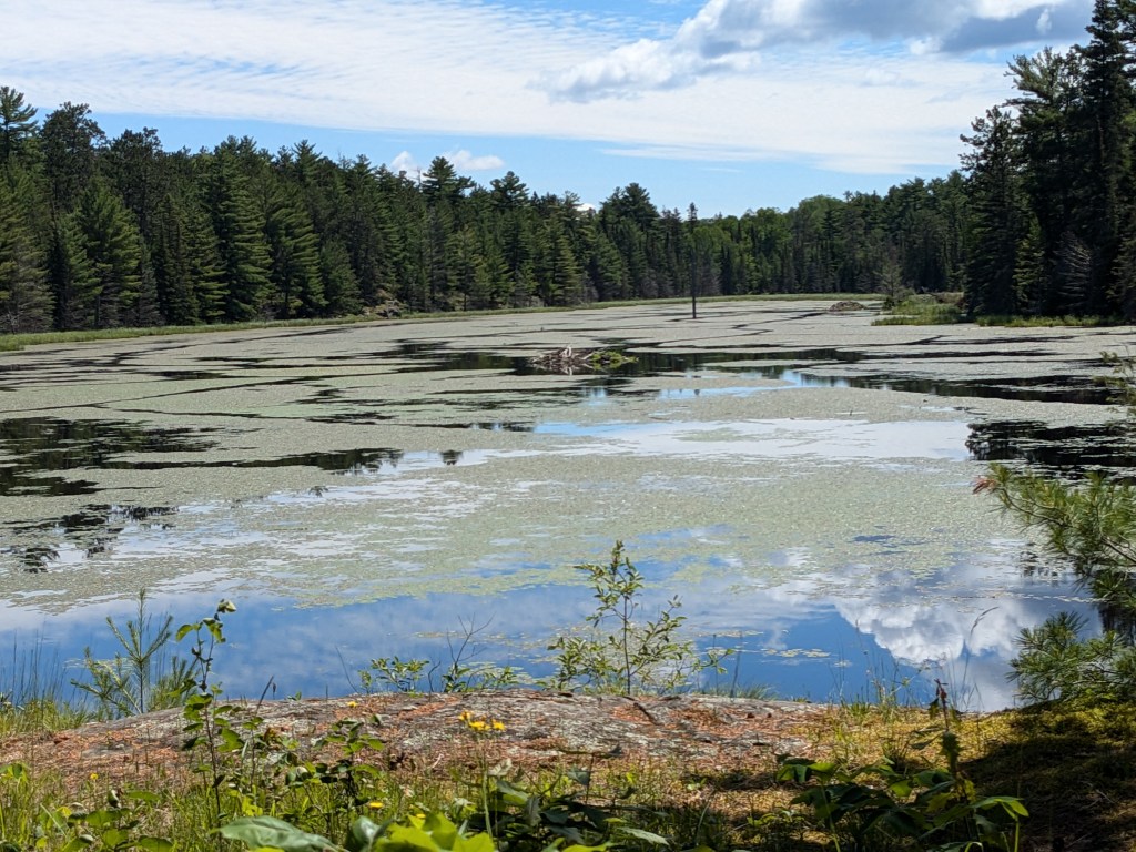 It was a perfect day, sunny and not windy with hardly a ripple on the water. Paddling across to the peninsula was easy, and thankfully there was a nice smooth landing place. The most challenging part of the adventure turned out to be following the half-mile of trail to the beaver pond.