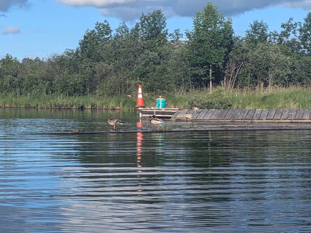Ironically, my chance to see a beaver came later. I decided to take one more paddle on the lake from my campground, but when I got out of the canal I discovered that the wind and waves on the open lake were a bit too much for my meager paddling skills. So I turned back into the shelter of the canal and decided to explore it. The canal was shaped kind of like a pi symbol (π) with the upper left corner connected to the lake and the two legs connected to a public boat ramp and my campground’s marina, respectively. The upper right corner was a dead-end, so I paddled down that way. I wanted to get a closer look at a couple of mallard ducks that I had spotted.