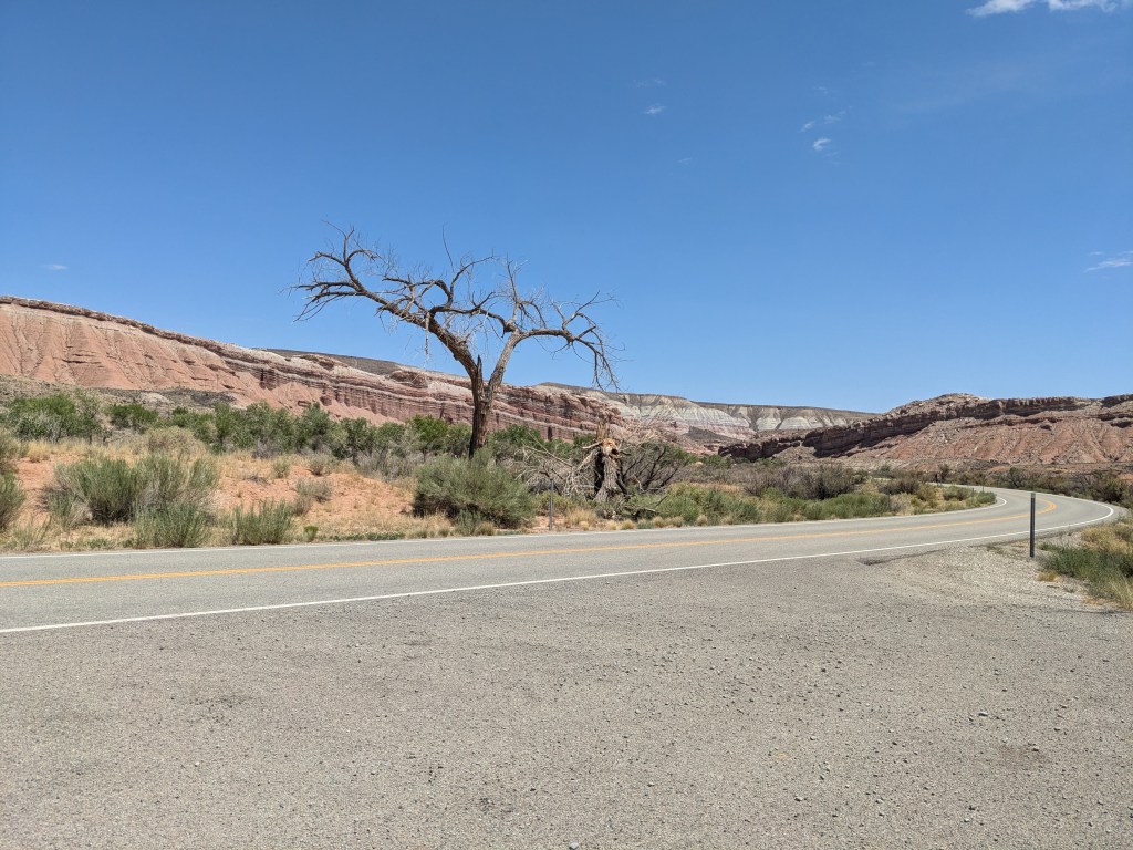With hiking off the table, I decided to see what I could see by car, so I drove along UT-24 to the eastern edge of the park. The different layers of sandstone in the cliffs make for a colorful spectacle.