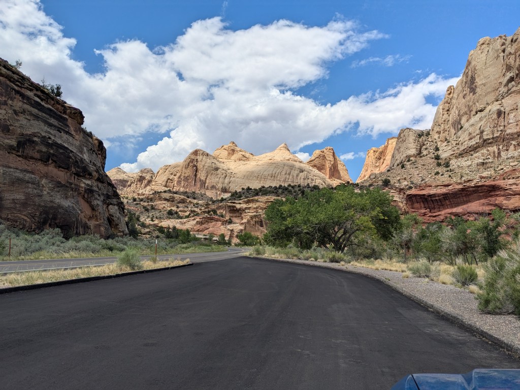 Unfortunately, Scenic Drive, which runs down into Capitol Gorge, is closed for reconstruction this summer past the Fruita Campground. (I know the National Parks always have construction and improvements going on somewhere, but it feels like I’ve run up against a lot of that this summer. I said earlier that Wind Cave was closed completely, and though I didn’t mention it, the Grand Viewpoint in Canyonlands at the end of the mesa was also closed.) This meant that my options for driving in the park were very short and limited. There ARE other roads in the northern and southern parts of the park, but they are unpaved and mostly 4WD only.
