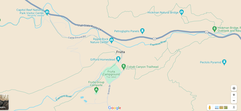 The park is a long, skinny band of land running north to south. It is crossed east to west in the middle by Utah Route 24. One nice paved road runs south from 24 as a scenic drive through the most dramatic landscapes of the park (imaginatively named “Scenic Drive”). The Visitor’s Center is at the junction of UT-24 and Scenic Drive, as is the historic area of Fruita, where early Mormon settlers lived and planted apricot, cherry, peach, and apple orchards.