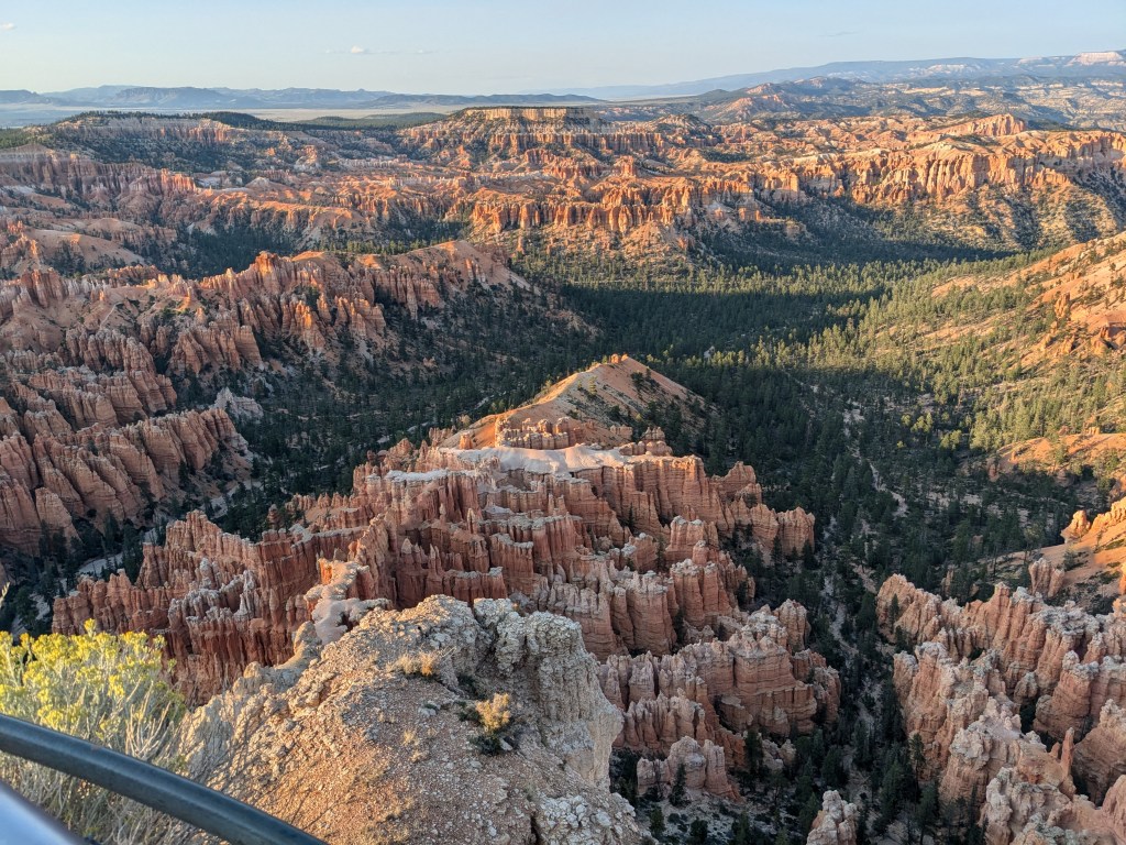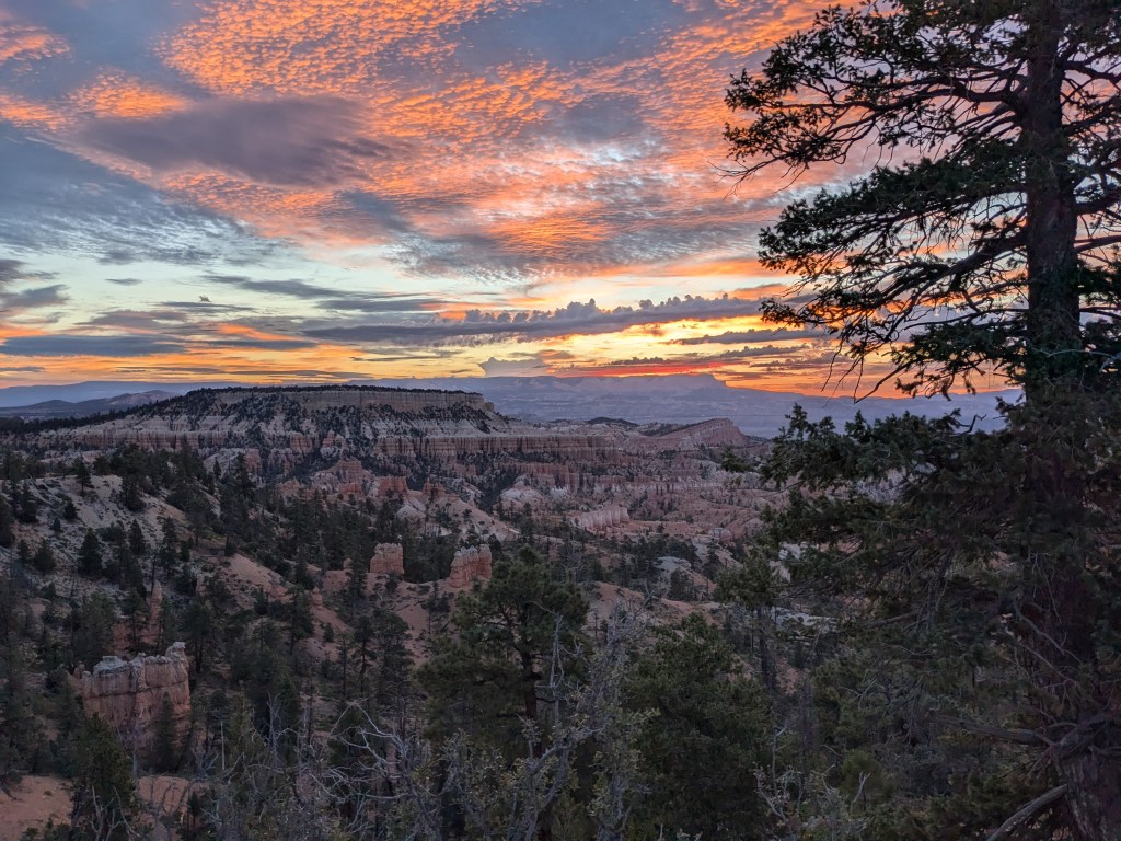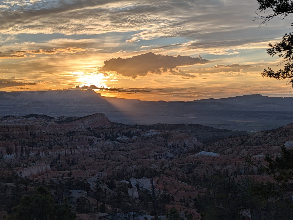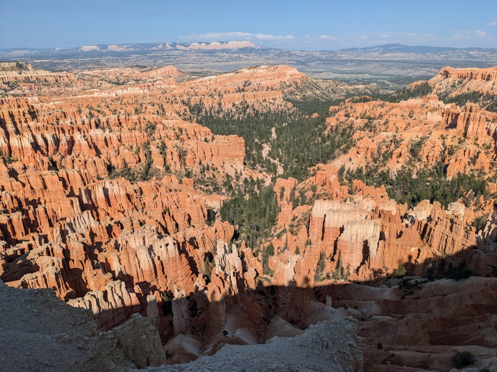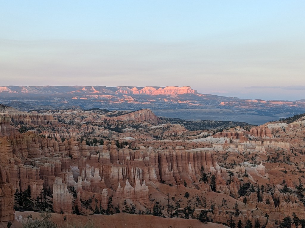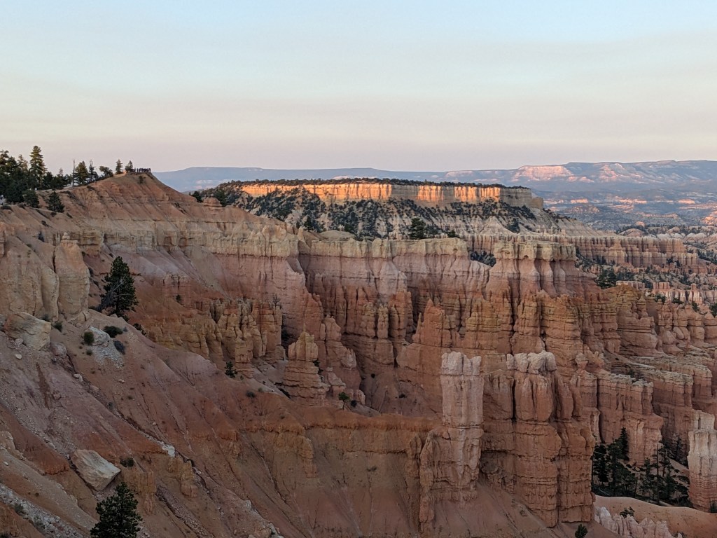 The sun was setting, so I went back to Sunset Point to watch it. Being on the western rim, you can’t watch the sun set over the canyon the way you can watch it rise; the sun actually sets behind the trees on the plateau. But you can watch the shadow of the western rim lengthen across the hoodoos until the last light fades from the distant peaks.