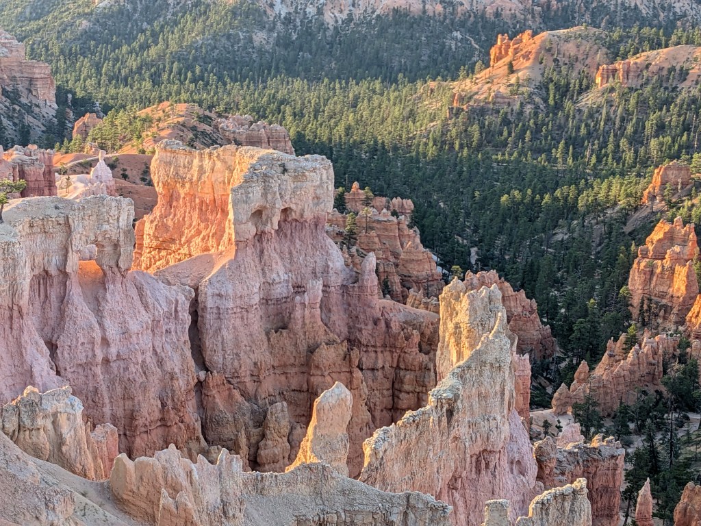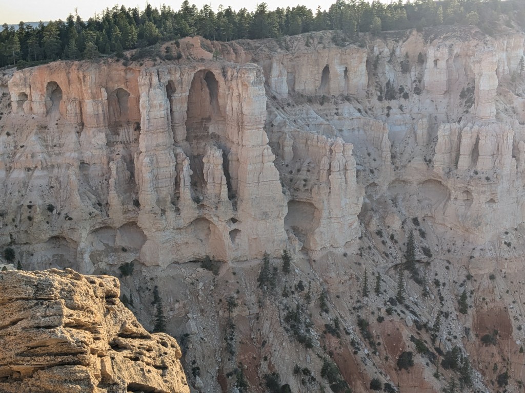 Once I turned the bike back in, I drove down to Bryce Point, which I hadn’t seen yet. That may have been my favorite of the overlooks. It had a view of these cool formations in white sandstone that looked like someone carved out the beginnings of a temple in the rock. I can see why the local Native Americans had legends about hoodoos as people turned to stone.