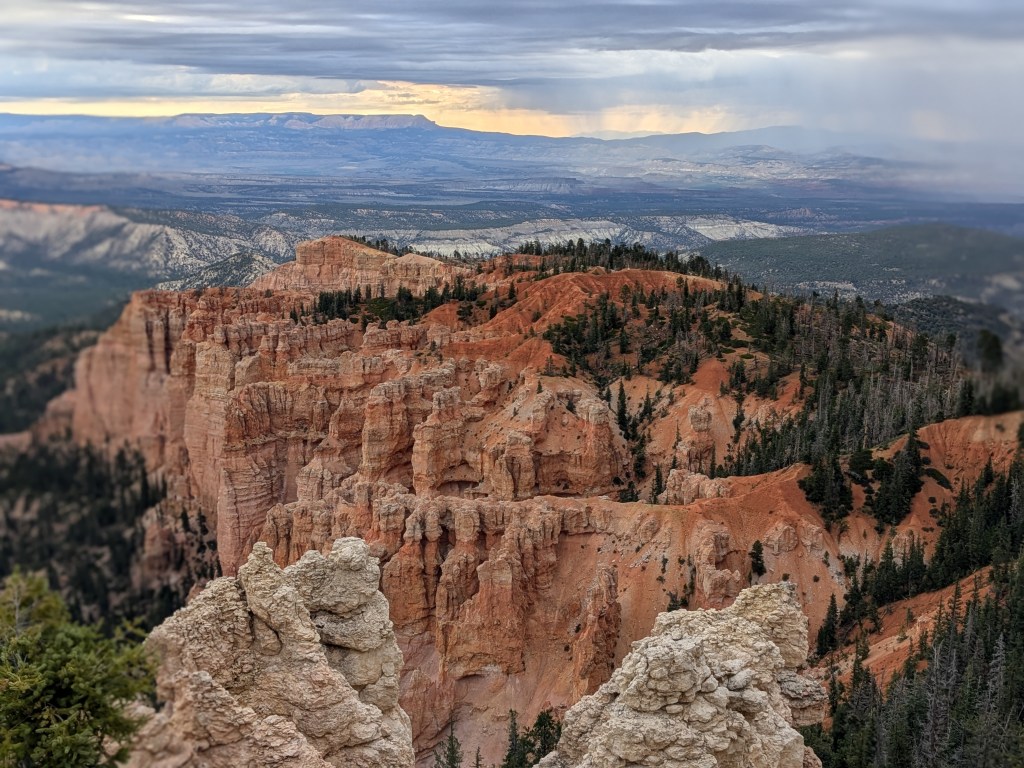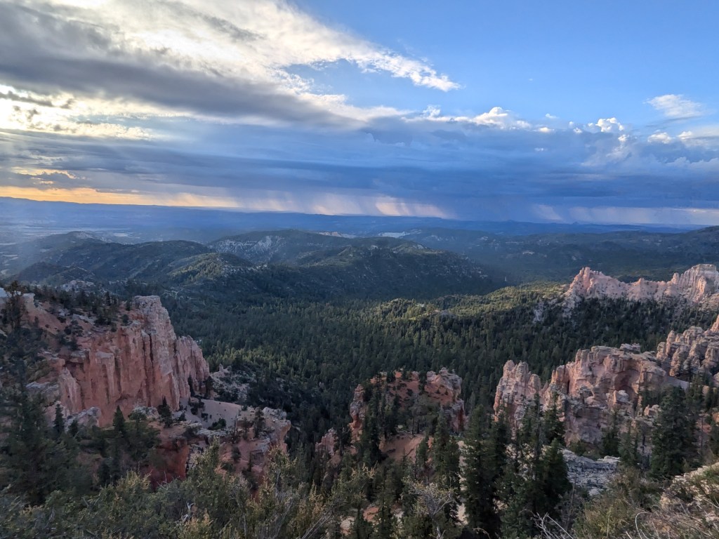As I headed south, clouds began to roll in over the east rim of the canyon, making the scenery even more dramatic. Lightning was flickering across the clouds, but I didn’t manage to get photos or video of that.