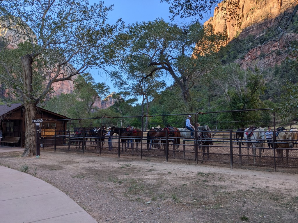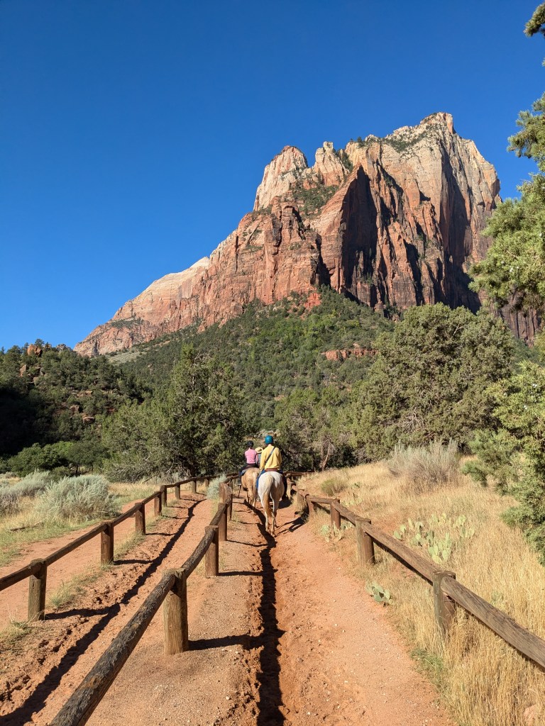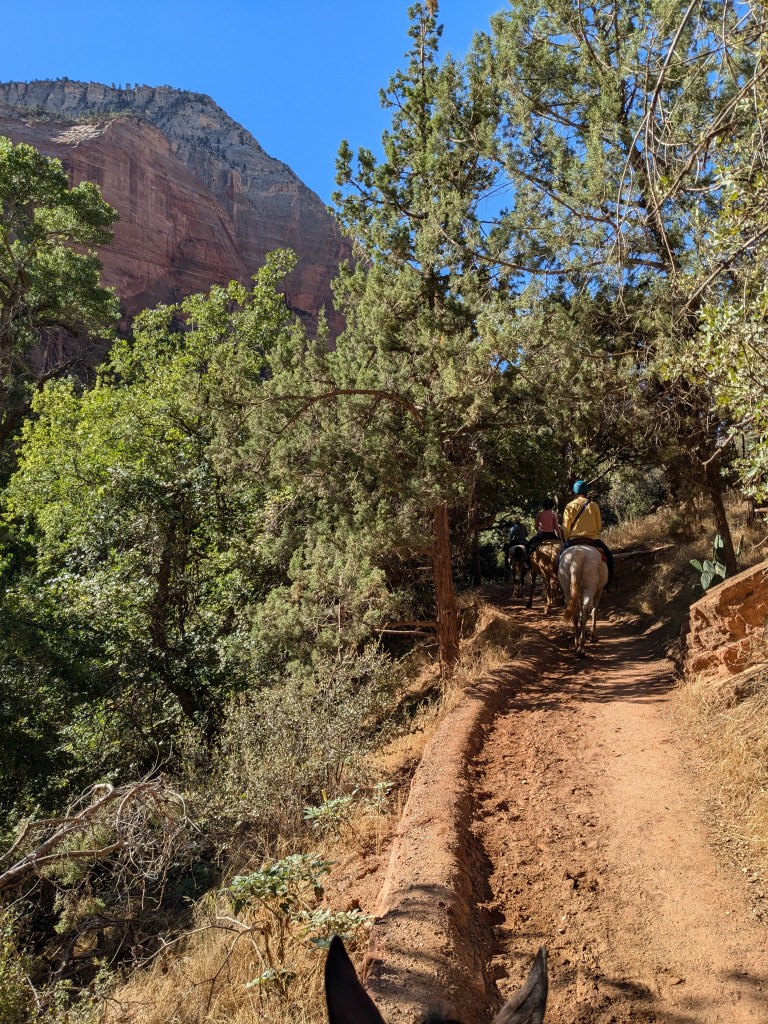 As it happens, I did have special permission to drive on part of it, since my trail ride started from a corral about halfway along it. (My parking pass was very specific that I was only allowed to drive to that spot, park, and then drive back out as soon as my ride was done.) The trail ride was to start from the Emerald Pools area and go south about a mile to the Court of the Patriarchs. The whole thing was scheduled to take an hour.