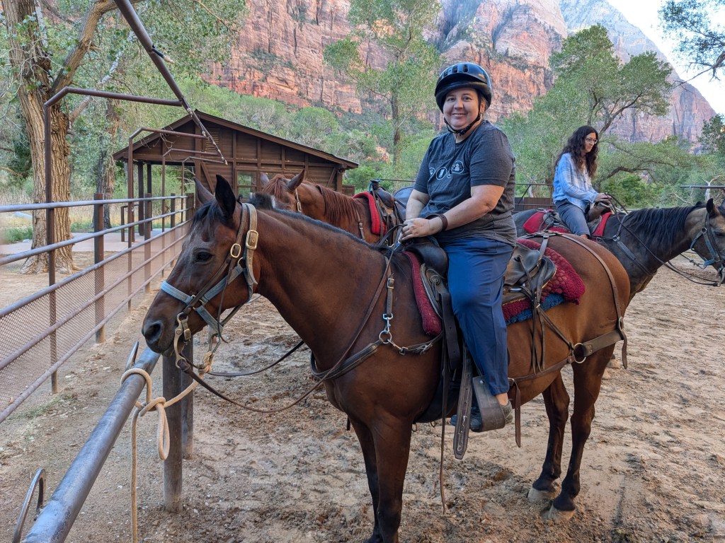 I wish I could have enjoyed that ride more. The two experienced riders ahead of me were laughing and talking with the wrangler, and the two novices behind me at least seemed to be managing ok. The weather was perfect and the trail was beautiful. But I was just so sore, and so frustrated with trying to keep Shadow up with the group, that I didn’t get to relax and enjoy it as much as I would have liked. I’m just being honest here. It didn’t improve matters that when we got back to the corral, the experienced riders executed graceful, light, perfect dismounts while I slid off my horse like an uncoordinated avalanche. But at least I didn’t fall flat on my butt.