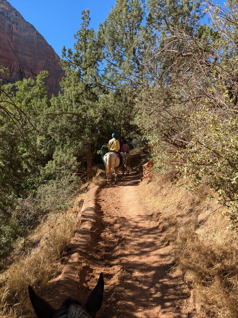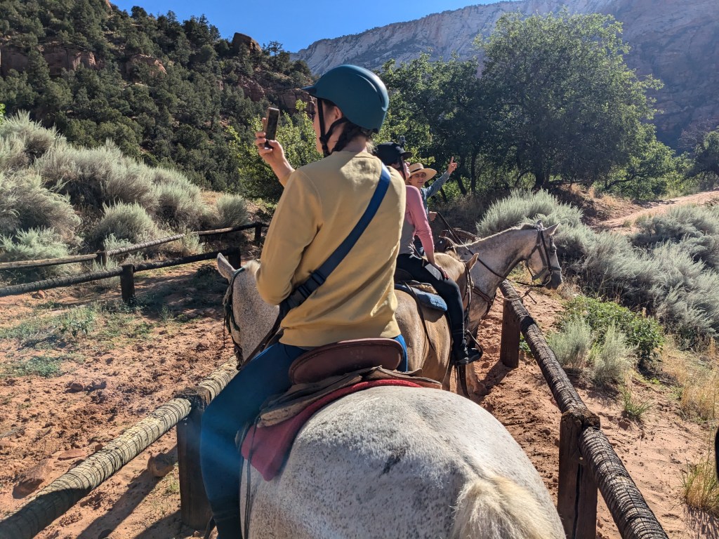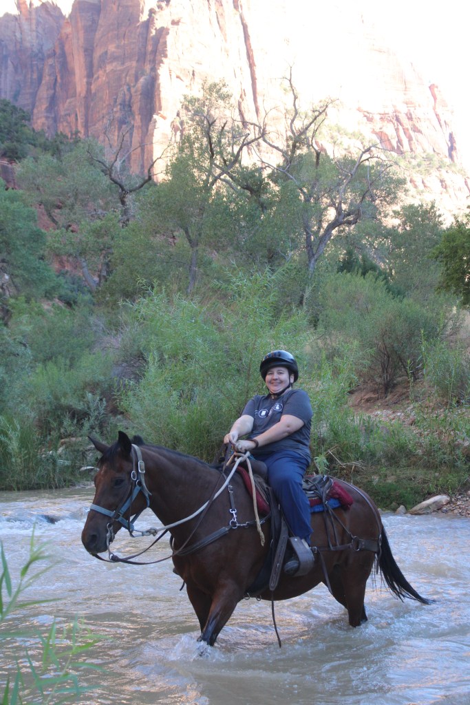 We set out, and almost immediately rode through a ford in the Virgin River. A photographer was on hand to take our pictures (which they sold to us for $10 at the end). Please ignore my poor form here… I know I’m leaning too far back. The river bottom was pretty uneven and I was trying to keep my balance and look at the camera at the same time.