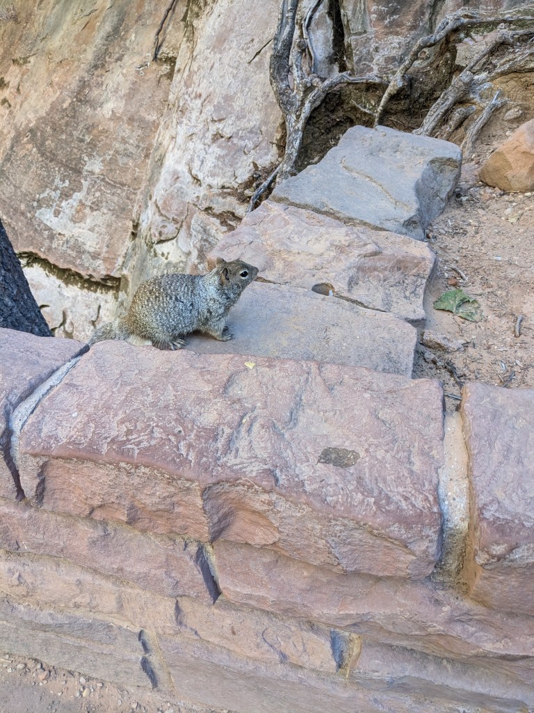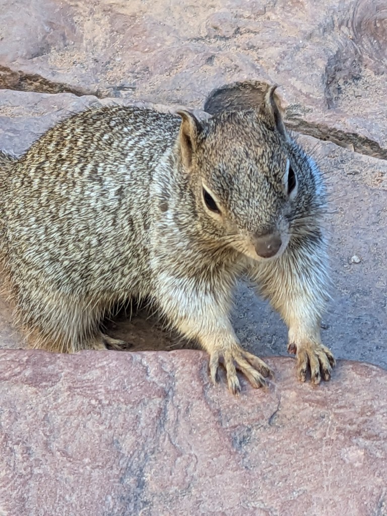 Meanwhile, the fat gray squirrels were having a field day picking up scraps that they dropped. I found the squirrels really interesting; most other places out west, I’ve seen chipmunks but no squirrels. These guys looked more like the gray squirrels we have in Texas, but with “frosted” fur. And they weren’t the least bit shy around humans.