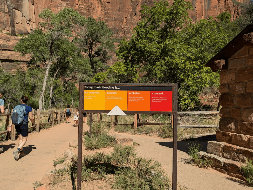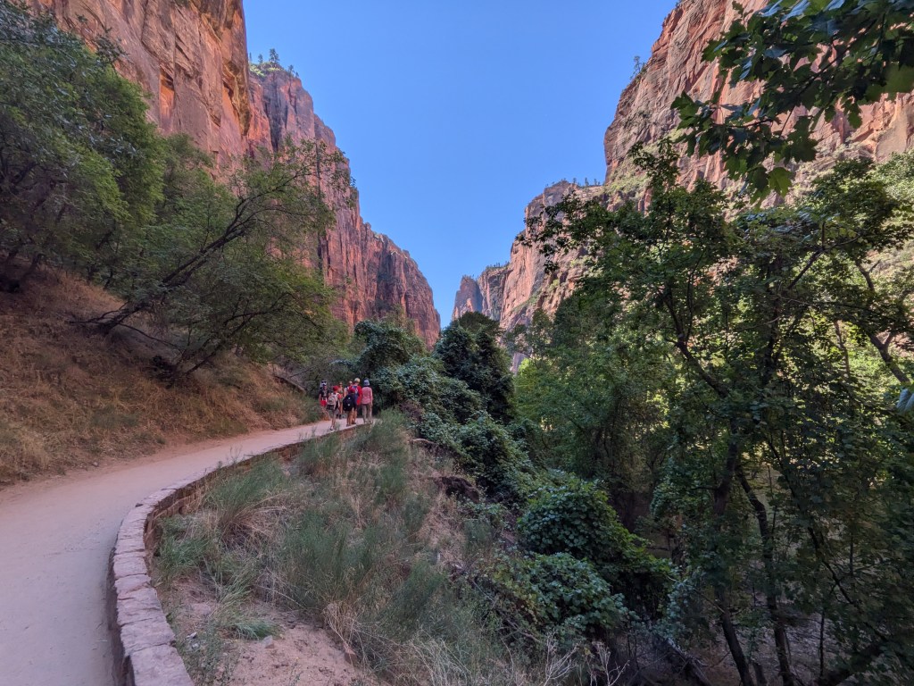 My plan had been to visit in the late afternoon when people were hopefully starting to leave, making it less crowded, but a look at the weather report told me that I would enjoy a second visit much more in the early morning before the temperature crept up to the upper 90s F (upper 30s C) at Zion’s lower altitude (around 3,000 feet). In retrospect, I don’t think that “people leaving” concept would have worked out, anyway. The parking was already full by the time I arrived around 9:30, and I doubt the situation improved any time before sunset. Going to the park on the morning of Labor Day Monday was probably not the best strategy for avoiding crowds… but it ended up being the time that fit best in my schedule.