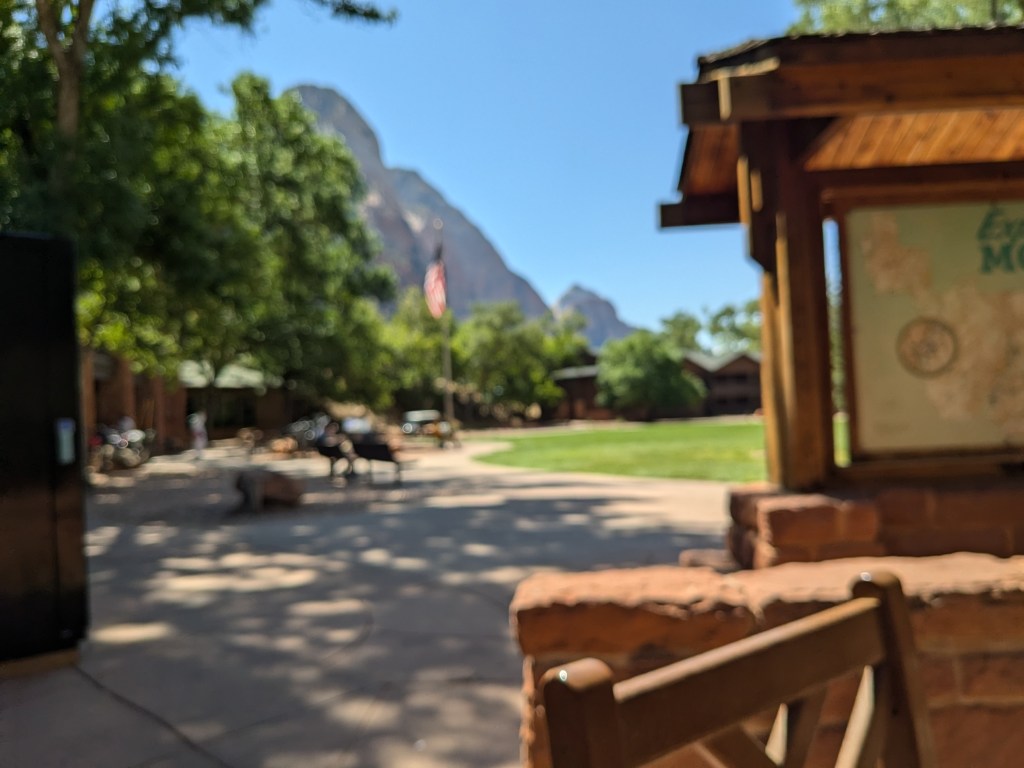 After hanging out a little while at the end of the trail, I made my way back to the shuttle stop and boarded a shuttle to leave. But I stopped halfway down the canyon road at the Zion Lodge to have lunch. It was an ordinary hamburger with an extraordinary view. (Only somehow my photo was blurry.)