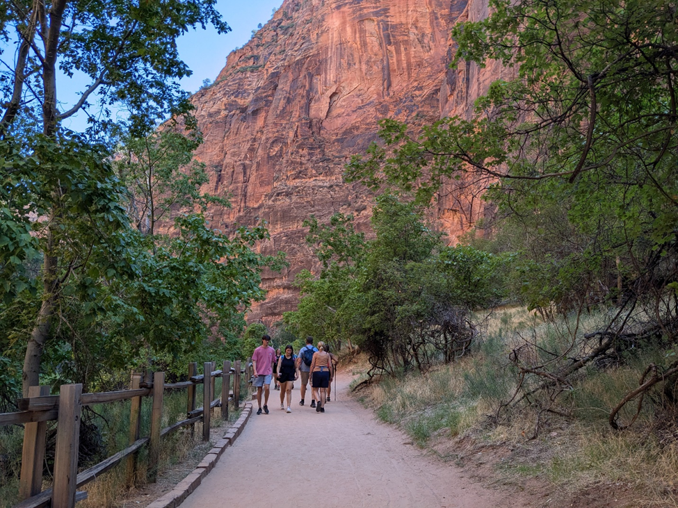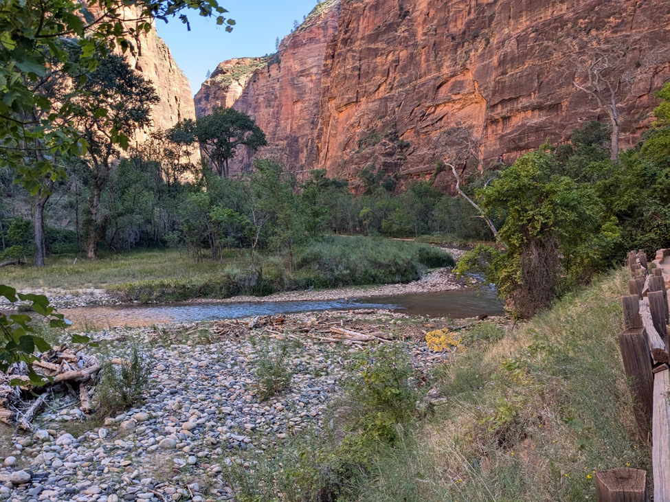 My destination was the mile of paved hiking trail that extends north from the end of the road along the canyon floor between the east wall and the Virgin River. Beyond the end of that, you can go on for a couple miles more by wading in the river itself part of the time and following a dirt trail beside it part of the time. Apparently, this takes you to an impressive passage known as Wall Street where the canyon walls are only 20 feet apart. However, I was not equipped for wading and I hate hiking in soggy sneakers, so I just planned to walk the paved part.