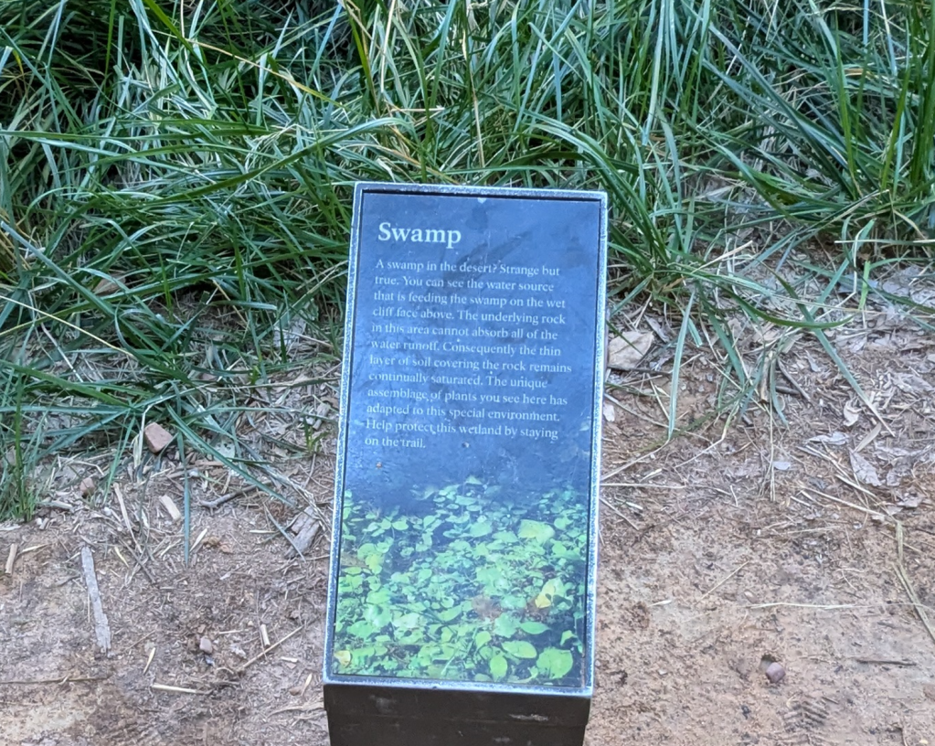 The GuideAlong narration said that rain that falls on the cliff tops can take a thousand years to percolate down through the walls and flow out through the porous rock layer at the bottom. But when it does, it creates “hanging gardens” on the cliff face.