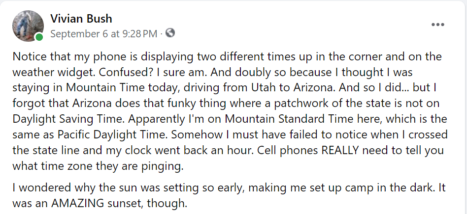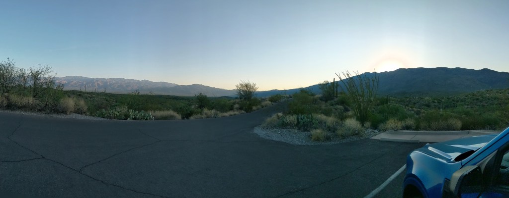 The sun kept setting “earlier” than I thought it should, so both days I arrived at my campsite at the tail end of twilight when I needed a flashlight to see what I was doing instead of an hour before the light faded. This is not ideal for getting an RV situated and plugged in. Then, to make matters more confusing, when I visited Saguaro National Park my cell phone must have pinged off a tower somewhere that WAS on Daylight Saving Time (in the Navajo Nation, maybe? They do practice DST) so my phone jumped back ahead an hour and my truck clock (which sets itself from my phone) got stuck on that for most of the day. There’s something to be said for having a clock that DOESN’T reset from cell towers as you move, so that you have a fixed point of reference to work out the time if you’re not quite sure where you are in relation to time zone boundaries. In fact I keep several of those in my RV, but I don’t have one in my truck. I still say cell phones need to tell you when they make a change like that. [/end rant]