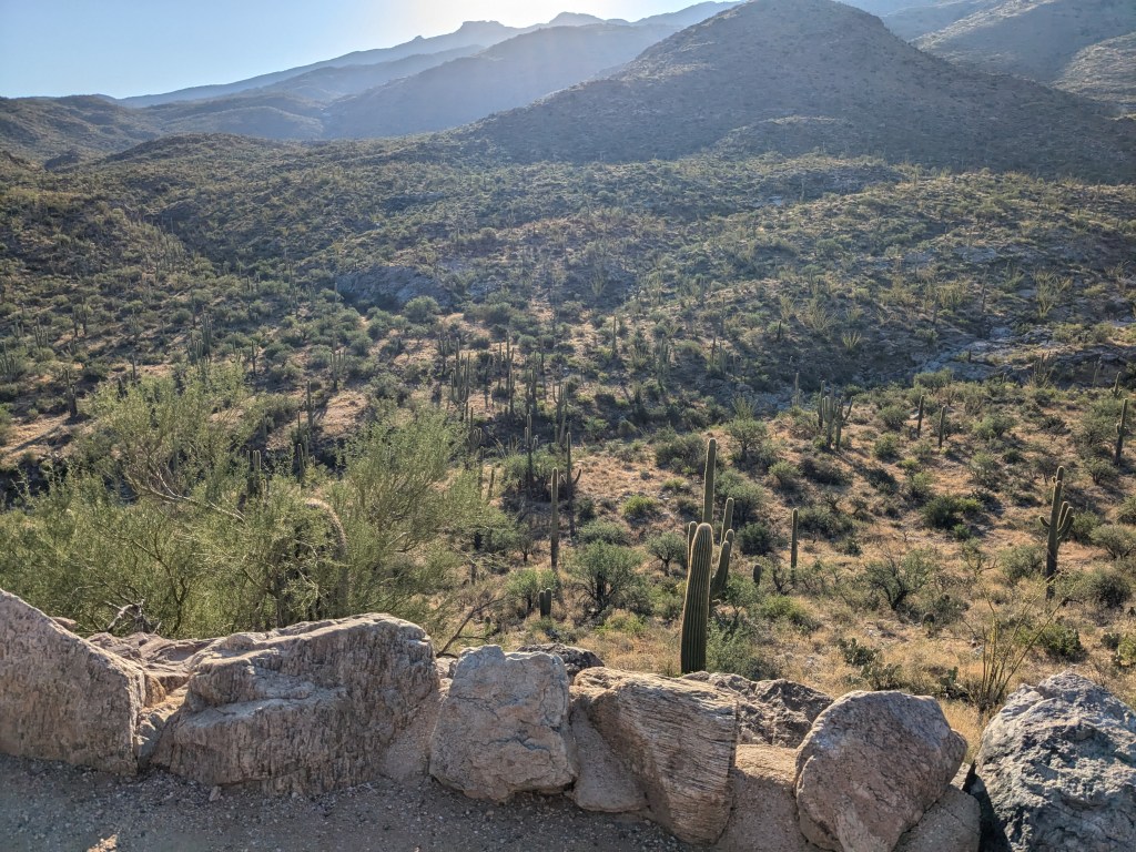 Of course, Cactus Drive is only a tiny fraction even of the East District of the park. I watched the interpretive film in the Visitor’s Center and saw footage of the higher elevations, which (as in Great Basin NP) are covered in lush pine forests. There’s a primitive campground up at the top, Manning Camp. But there is no motor vehicle road to get up there; you have to hike uphill for miles or take horses/ mules. My little flat-ish one-mile hike had been enough for me, so I wasn’t down for that. I asked the ranger about it, and he advised me to drive up to Mount Lemmon instead. It’s outside the park, but offers some of the same type of countryside as the wilderness area maintained within the park.