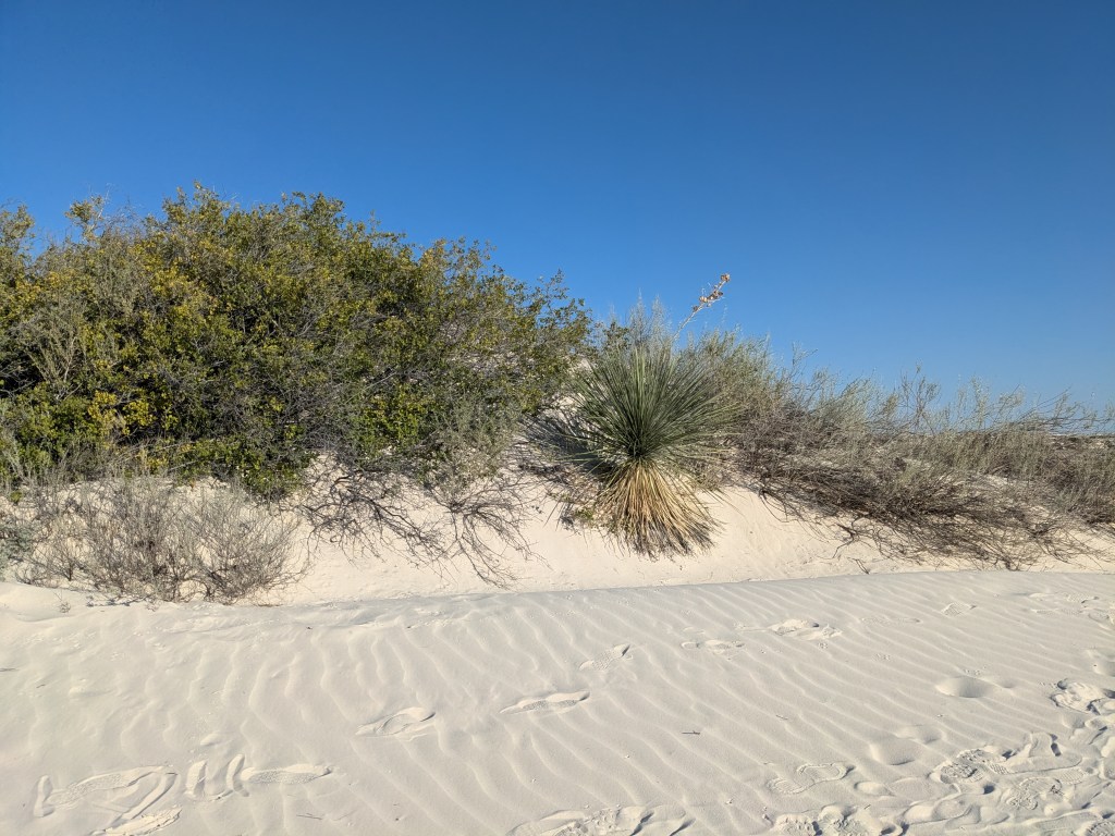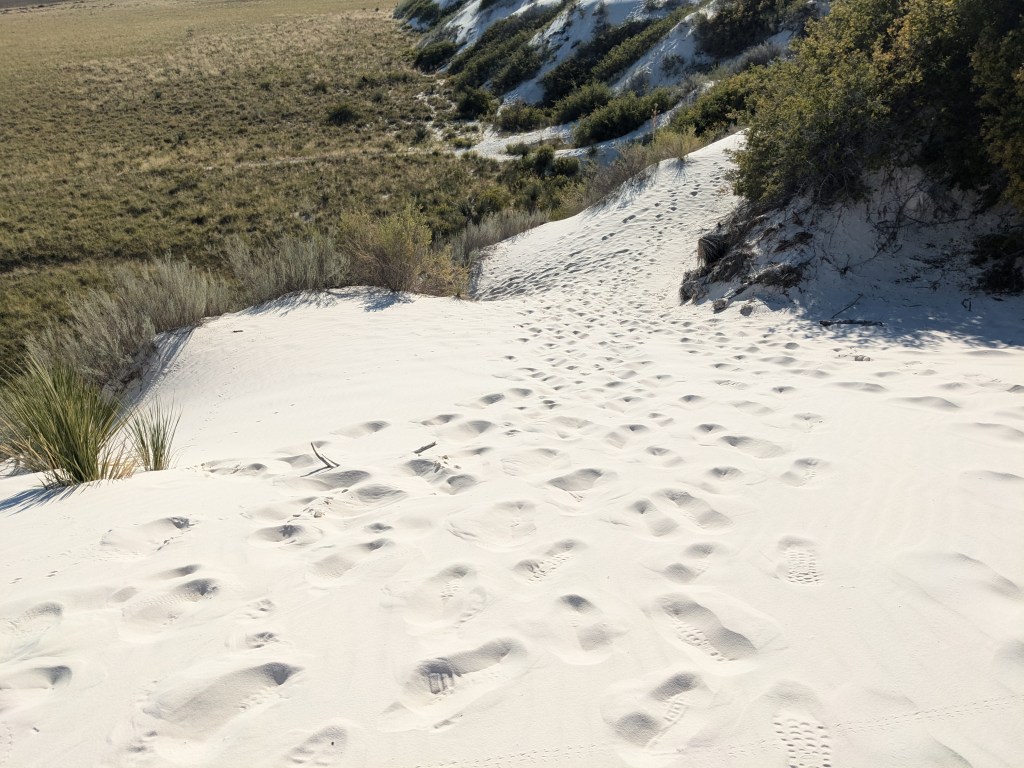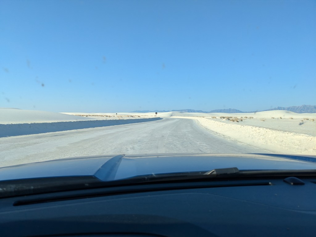 The dunes at White Sands are tiny compared to those at Great Dunes National park. I don’t think there’s anything there that you can’t climb in 5-10 minutes, while the biggest dunes at Great Dunes were the size of mountains and took an hour or two to climb. But these dunes are unique for their composition. They are “white” because the sand is made from gypsum, like the material in sheetrock, rather than the quartz you find in “yellow” dunes. Driving among them felt weirdly like driving through snowbanks, especially in places where the sand had been plowed up into ridges along the sides of the road.