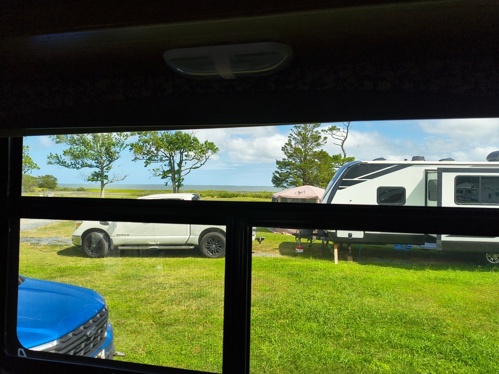 As I already said, I am doubly surrounded by water here — the Atlantic and the river and Chesapeake Bay. My biggest concern with Erin is that even if it doesn’t hit land here and curves back out to sea as predicted, they are talking about dangerous tides and rip currents along the East Coast. We’re a little bit sheltered here from waves by a chain of barrier islands that I can see out my window, so the water in front of me is more like a bay than open ocean. But I imagine that even a little bit of storm surge could bring it up over the marshes and into our campsites. This is where hyper-local knowledge becomes important — knowledge I don’t have just by looking around me here. I don’t know exactly how much surge it takes to flood this place, or to endanger the road to the north. Depending on what Erin does in the next couple of days and what the forecast track looks like, I may be asking the campground manager these questions so that I can make an informed decision about whether and when to leave. Even if the storm “misses” and there’s no general evacuation, I don’t want to be here with an angry sea lapping at my doorstep.